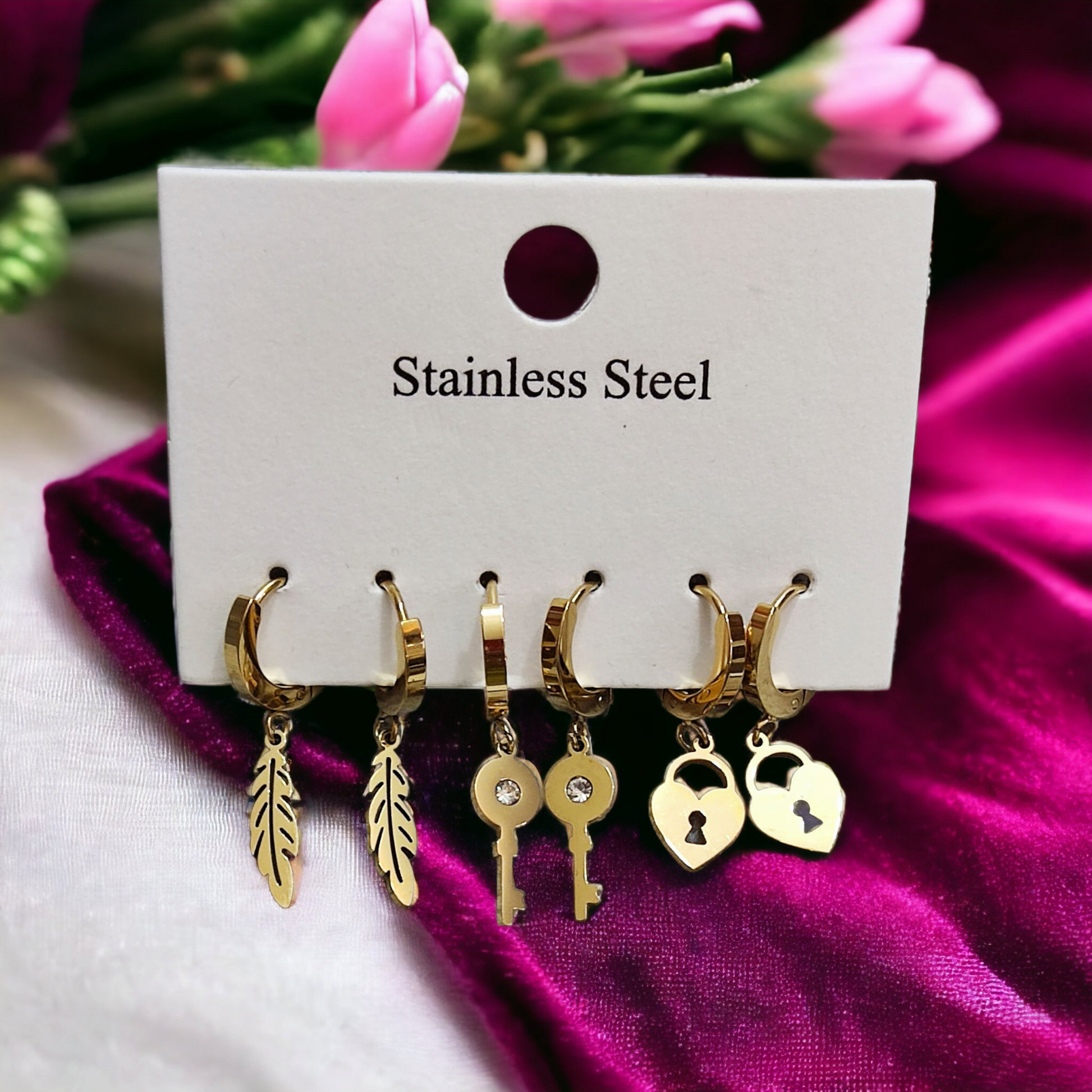 Unlock a little drama, a little dream. The Feather & Key earrings set is a golden trio of charm hoops that balance freedom, mystery, and romance — all in one.