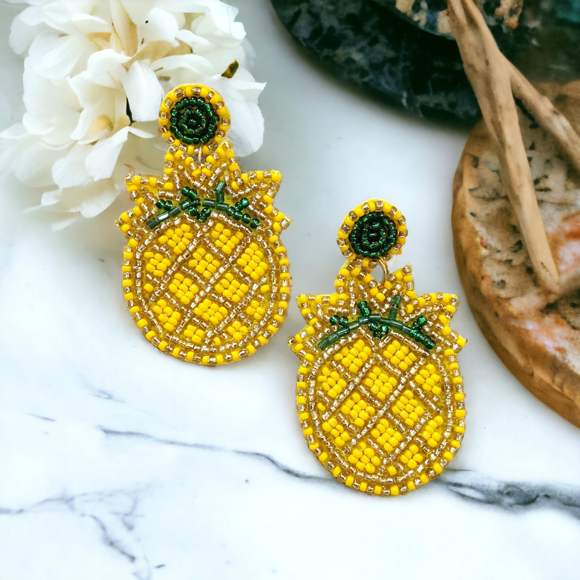 Tropical vibes on point! These Pineapple Pop Danglers feature vibrant yellow beads and sparkly green accents, bringing sunshine to your ears and a fruity twist to your accessory game.