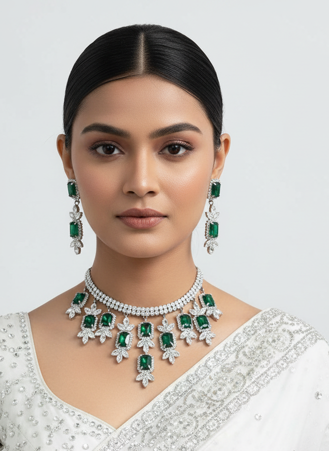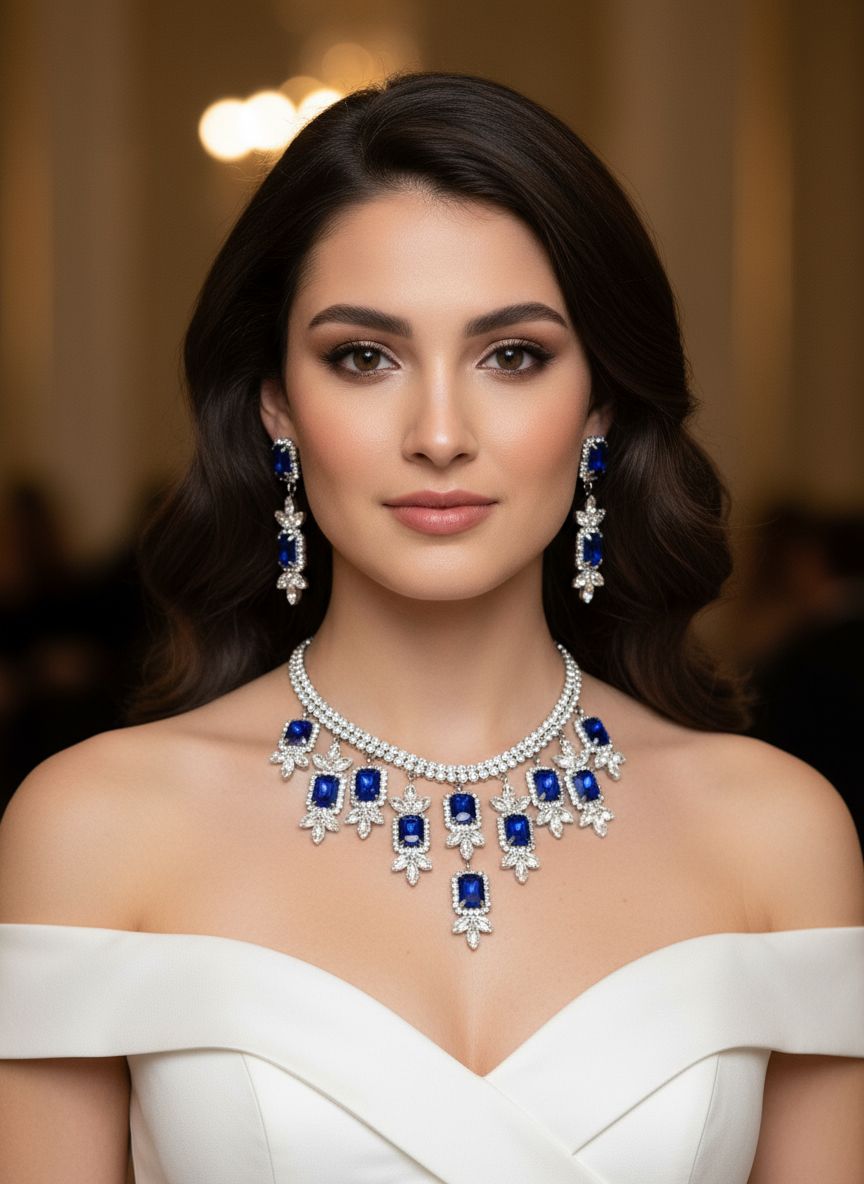 Available in Emerald Green and Sapphire Blue, this versatile set is perfect for weddings, receptions, festive occasions, and luxury evening wear. Crafted to complement deep necklines and elegant ensembles, it delivers a royal finish without overwhelming your look.