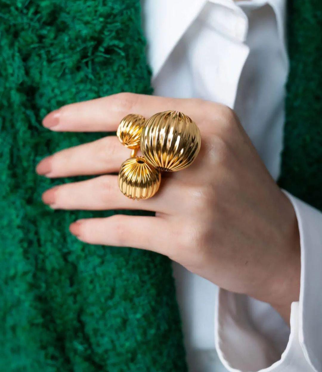 Bold curves meet golden elegance in The Dôme Set — a sculptural trio of rings that redefine statement jewelry. Inspired by architectural forms and high-fashion minimalism, each ring features a radiant, pleated dome in varying sizes, crafted in anti-tarnish brass with a luxe gold finish.